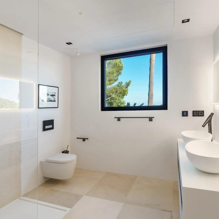 Inside, Luxury Villa Ibiza with Pool has been designed to let the outside world in. Floor to ceiling windows let the magnificent Mediterranean Sea view in whilst flooding the stylish interior with sweet summer sunshine. Design is everything here. Open plan living spaces flow from one to another making this home the ultimate summer retreat for those wanting a get together in smooth sophistication. Elegant furnishings and suave artwork create a feeling of grandeur whilst modern touches bring the piece right up to date. Couple that with a high tech Bang & Olufsen system throughout the interior and in several zones outside and you’ve found your zen right here.