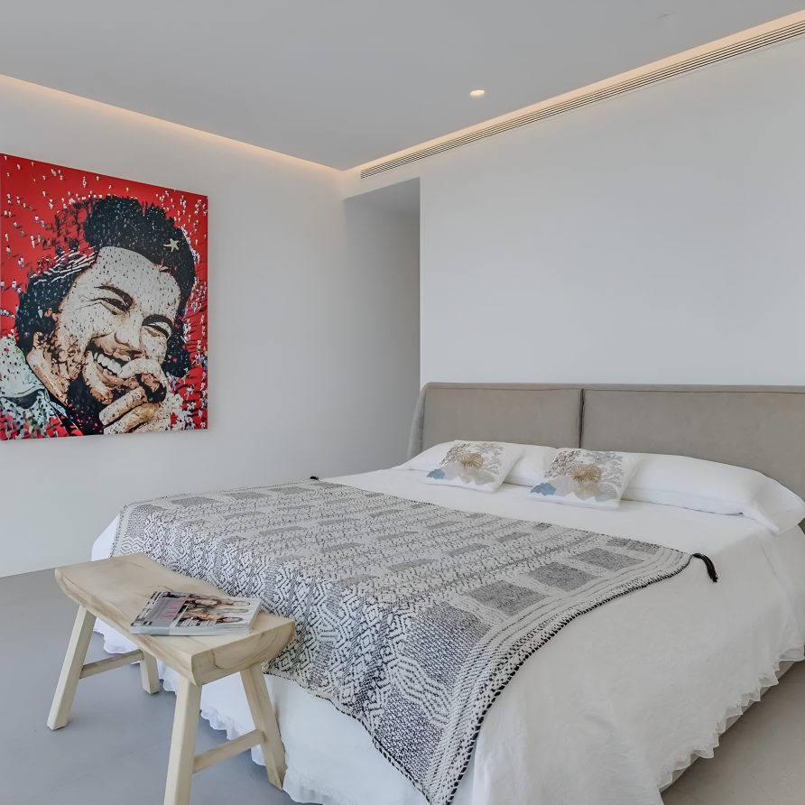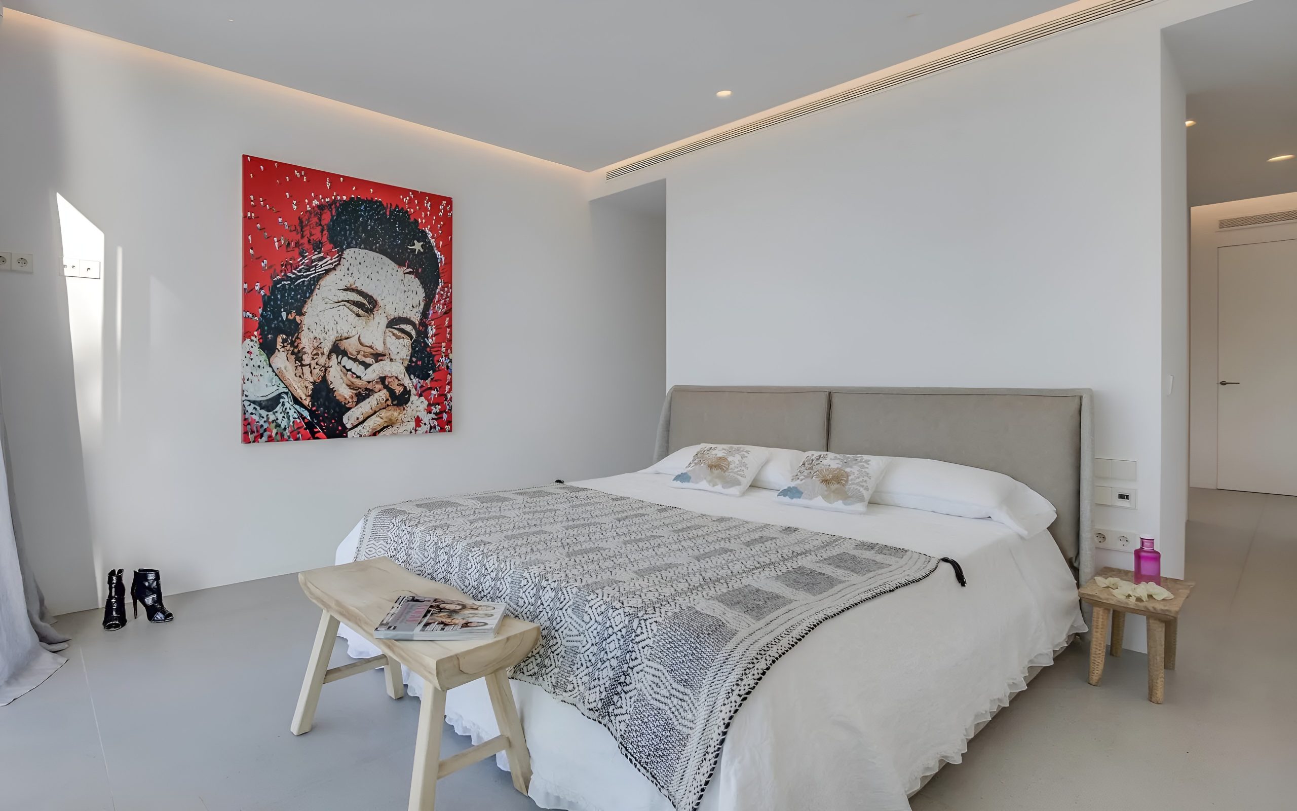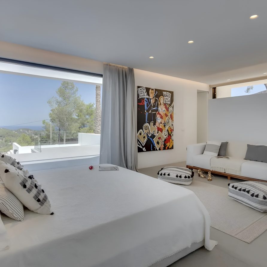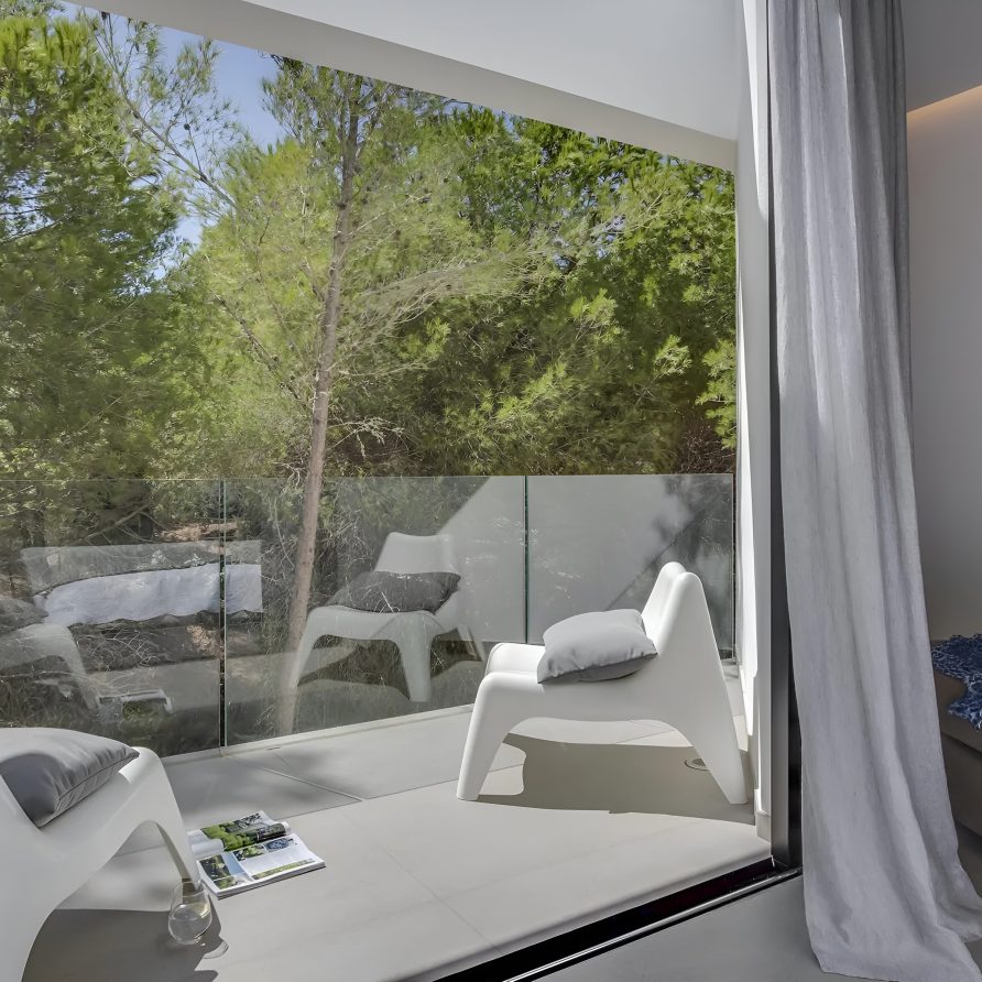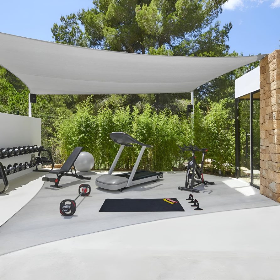 It’s the simple things that transform minimalism into a masterpiece. Creating a white box in a pine forest is one thing; having the grounds cascade down the hill incorporating a gorgeous lap swimming pool, luxurious loungers, pampering palms and impeccable stone masonry and you have, quite simply, a work of art. Not one but two outdoor lounges sit on the grand outdoor terraces, one shaded by the modern cabana and at certain points on the clock, the other by the natural shade of the pine forest. Tucked away in a corner you will find the outdoor gym and shower, so you never have to pull yourself away from the Ibizan sunshine during your workout.