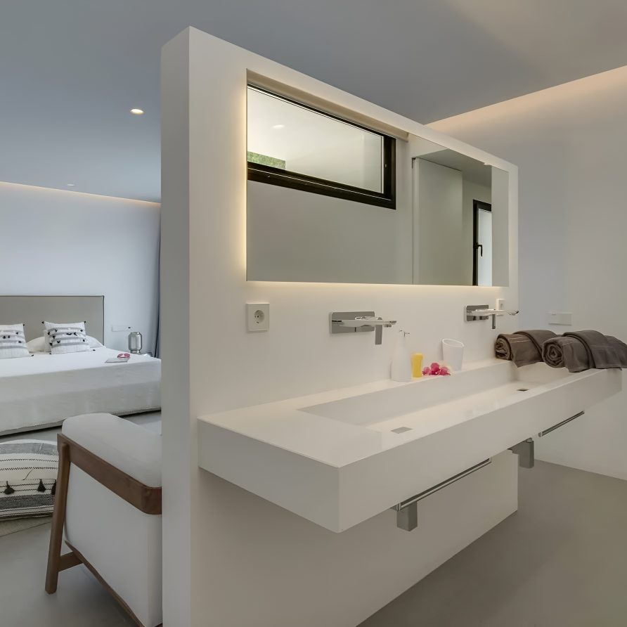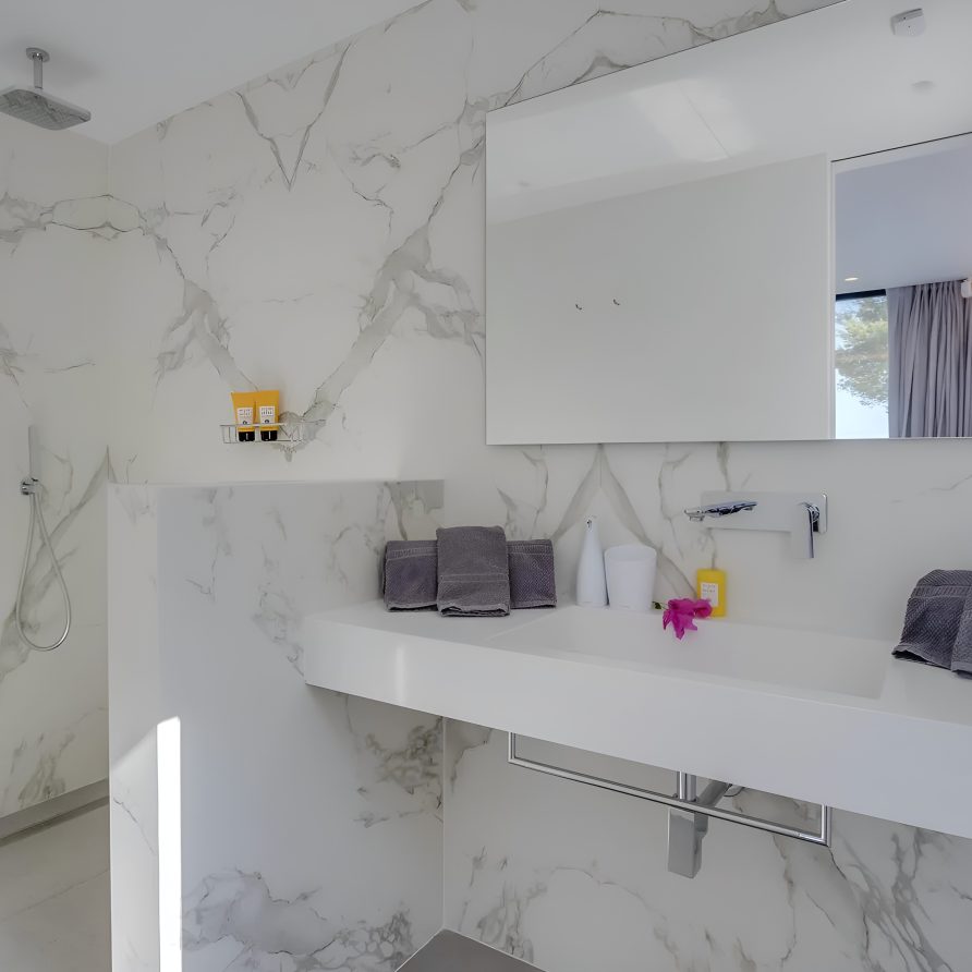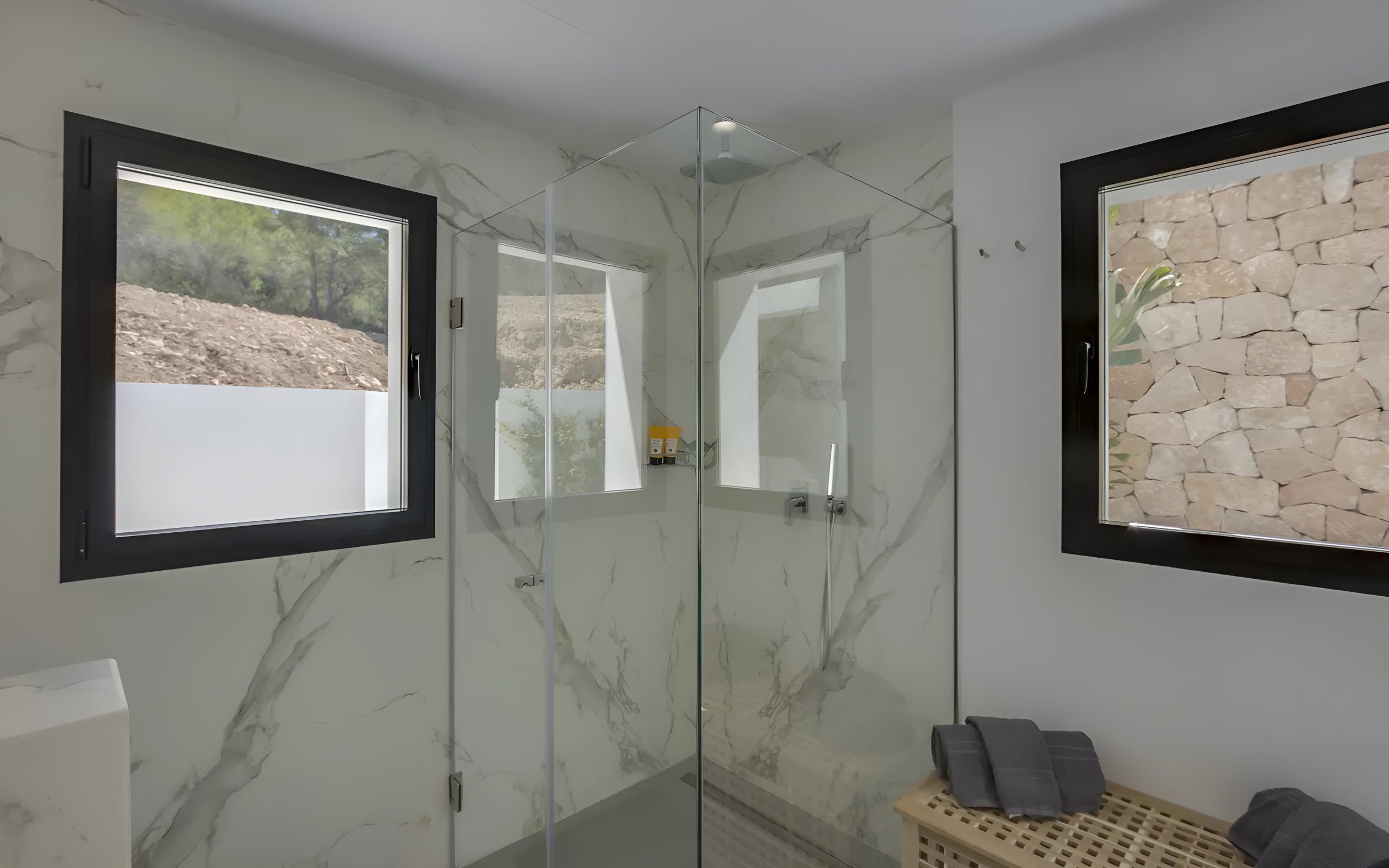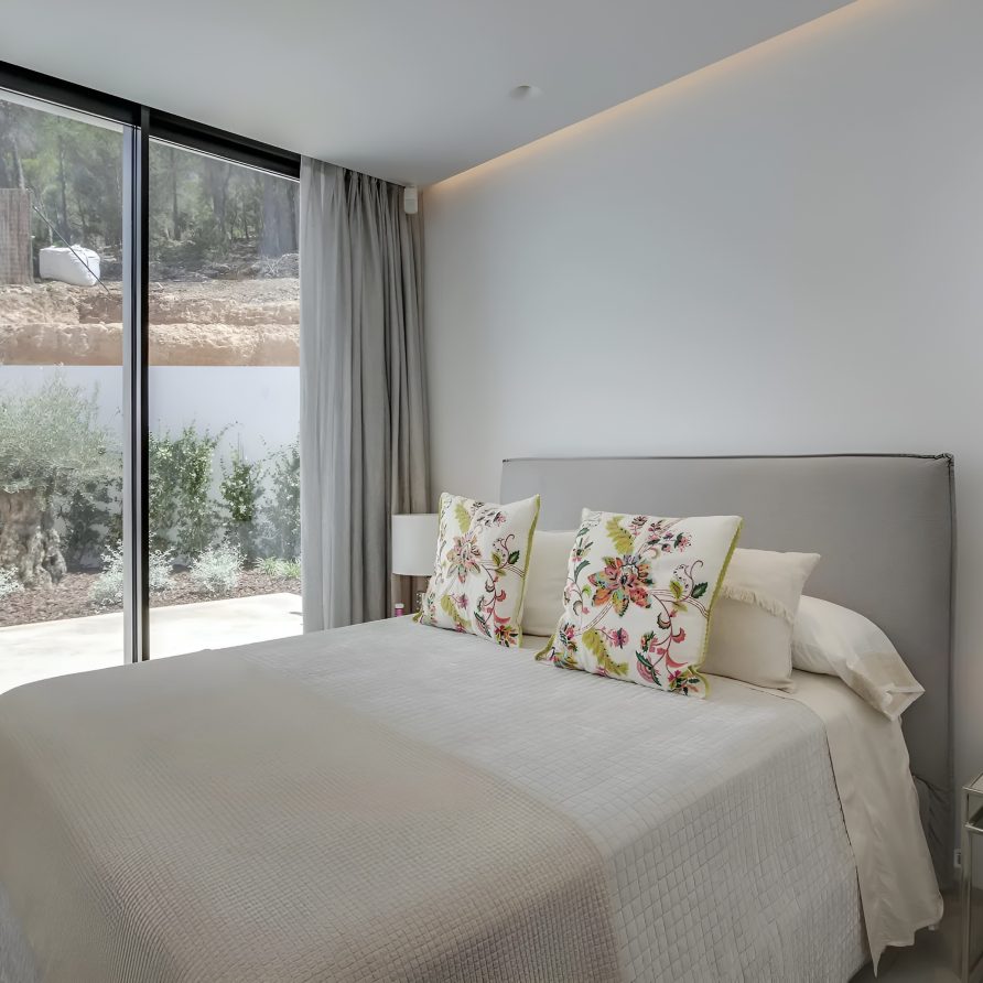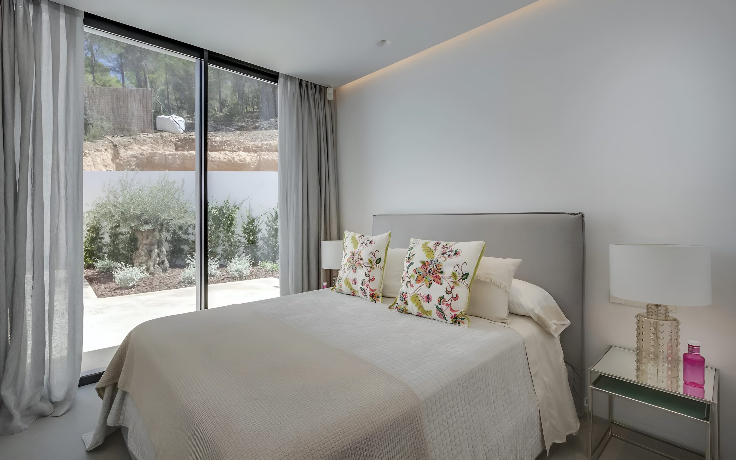 It’s the simple things that transform minimalism into a masterpiece. Creating a white box in a pine forest is one thing; having the grounds cascade down the hill incorporating a gorgeous lap swimming pool, luxurious loungers, pampering palms and impeccable stone masonry and you have, quite simply, a work of art. Not one but two outdoor lounges sit on the grand outdoor terraces, one shaded by the modern cabana and at certain points on the clock, the other by the natural shade of the pine forest. Tucked away in a corner you will find the outdoor gym and shower, so you never have to pull yourself away from the Ibizan sunshine during your workout.