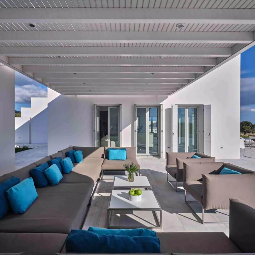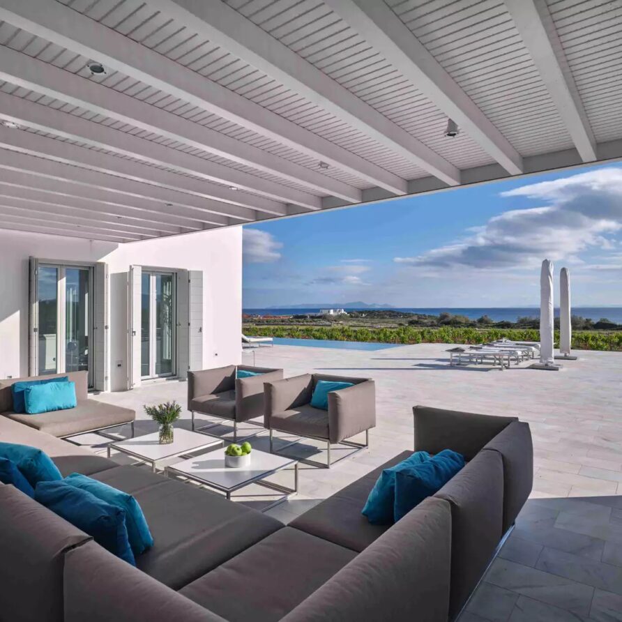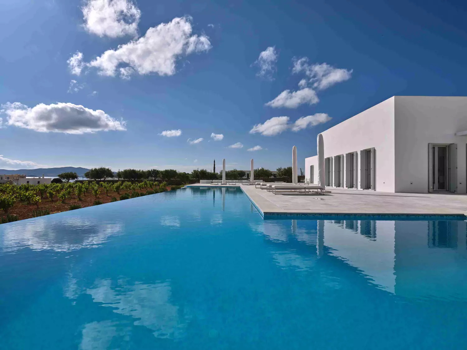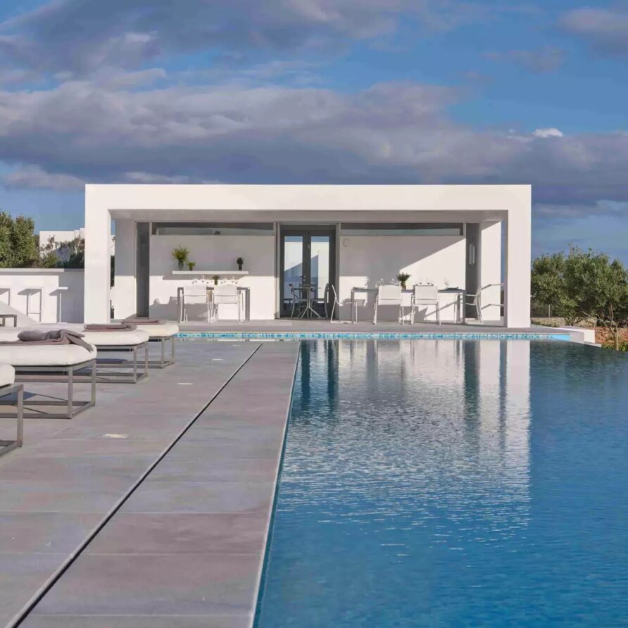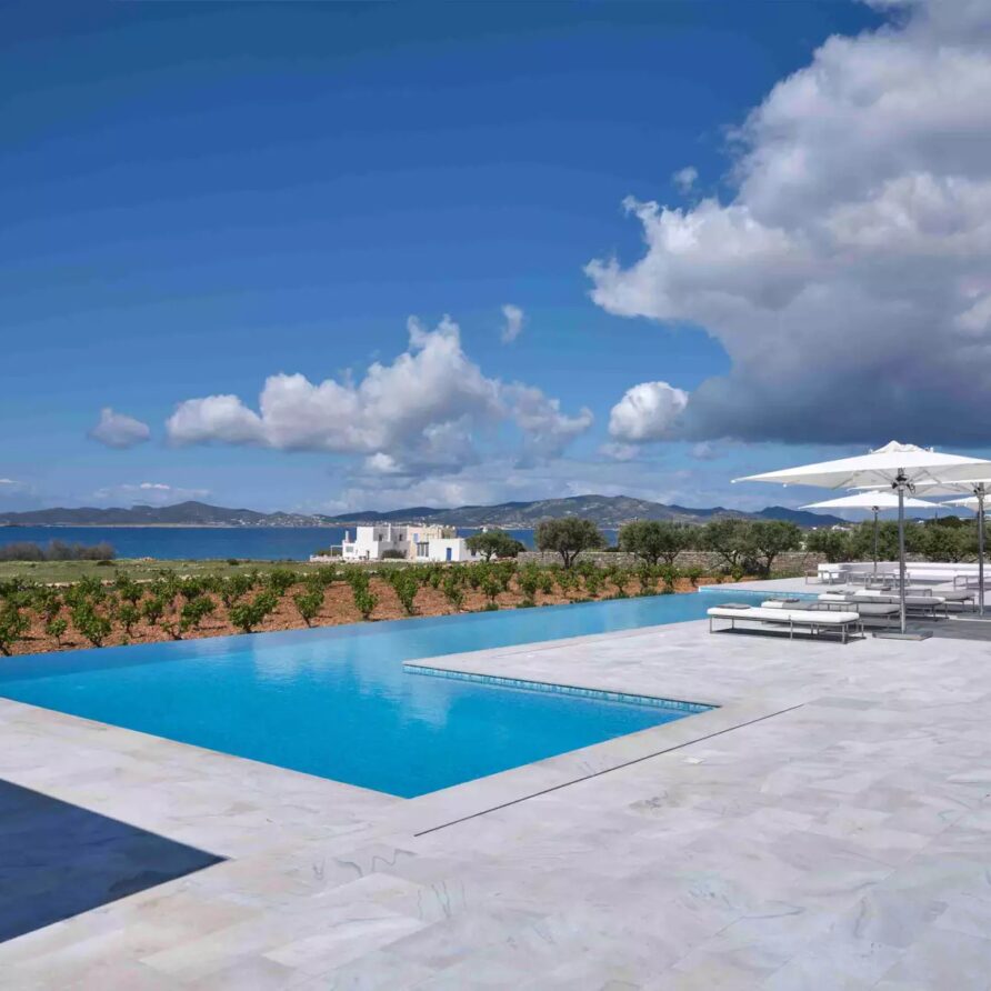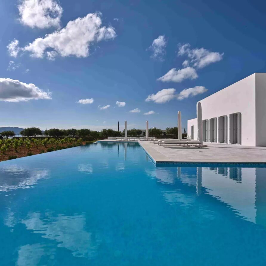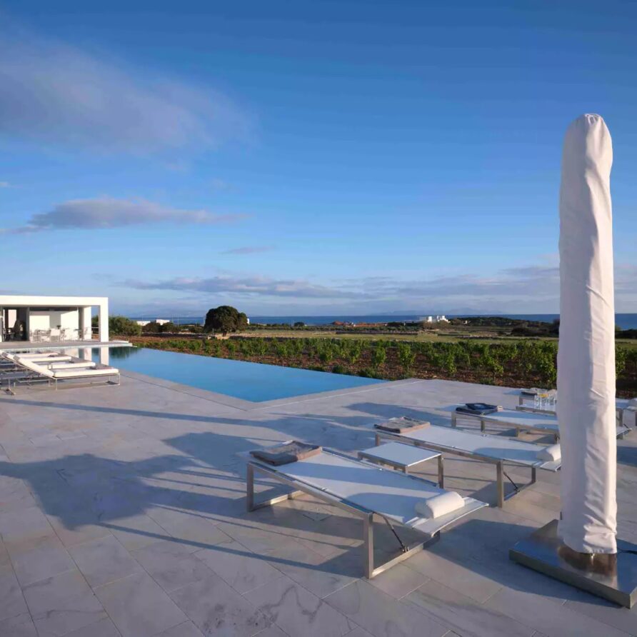 Despite its total minimalism, the villa is quite generous when it comes to diversified facilities: a wine cellar and fitness room are located on its lower level while, outside, guests can practice tennis in the villa’s private court and, at night, indulge in an atmospheric movie under the starlit sky in the movie area with a projector. Surrounded by grapevines, gardens with local and Mediterranean herbs and olive trees, the villa’s vast pool terrace features its 25m long swimming pool, several lounging spots and a pergola shaded sitting and dining area, a small bar and a professional barbecue kitchen.