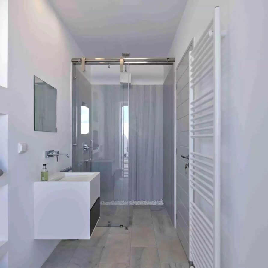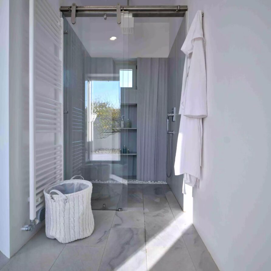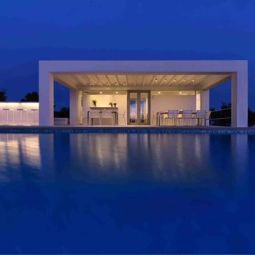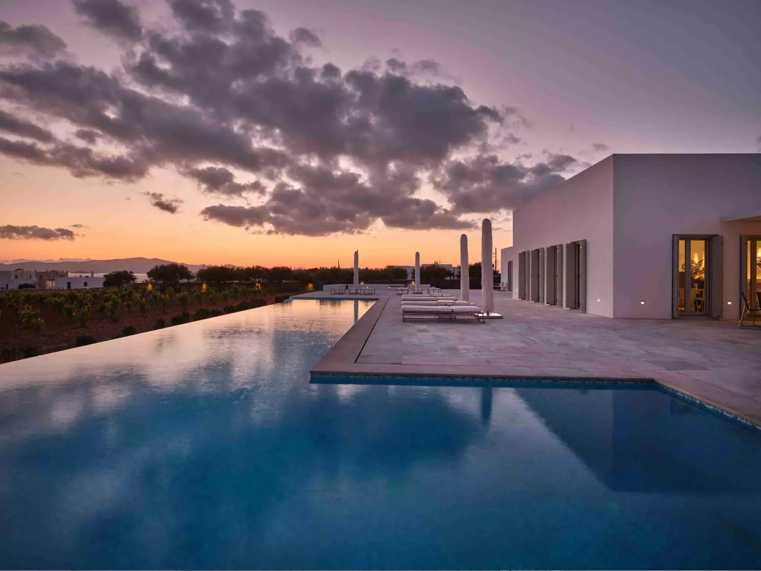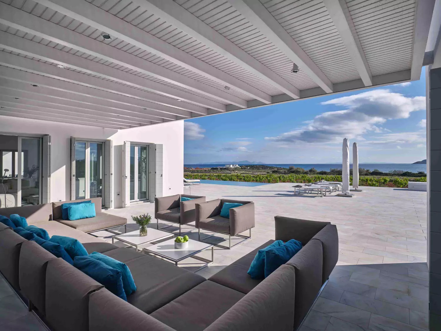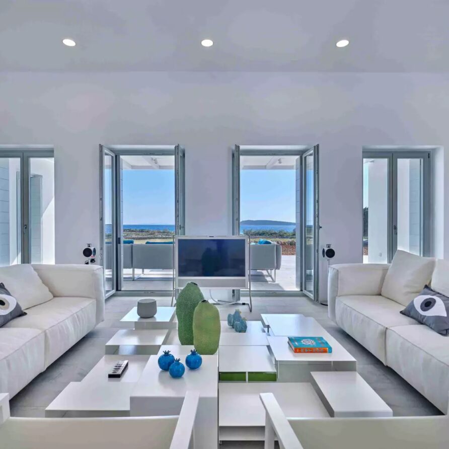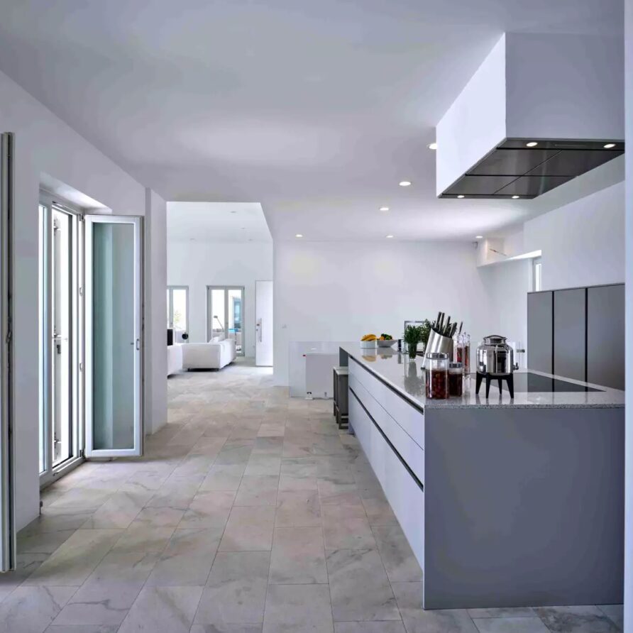 Despite its total minimalism, the villa is quite generous when it comes to diversified facilities: a wine cellar and fitness room are located on its lower level while, outside, guests can practice tennis in the villa’s private court and, at night, indulge in an atmospheric movie under the starlit sky in the movie area with a projector. Surrounded by grapevines, gardens with local and Mediterranean herbs and olive trees, the villa’s vast pool terrace features its 25m long swimming pool, several lounging spots and a pergola shaded sitting and dining area, a small bar and a professional barbecue kitchen.