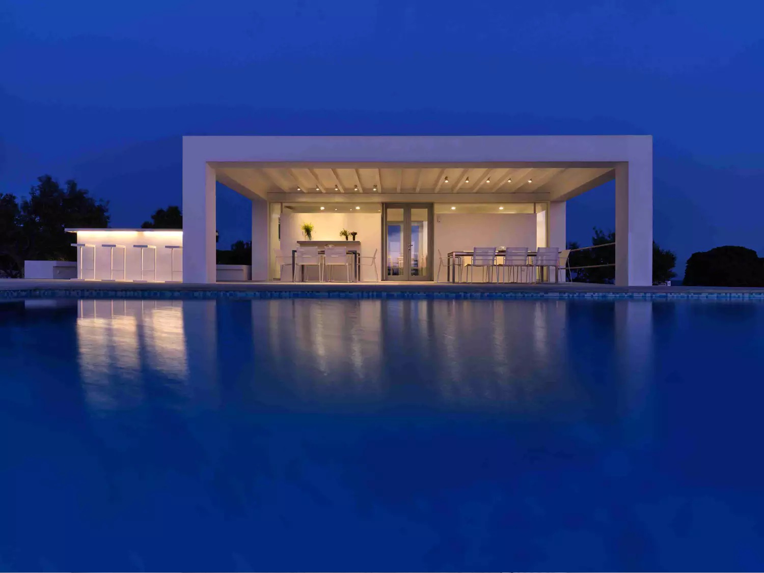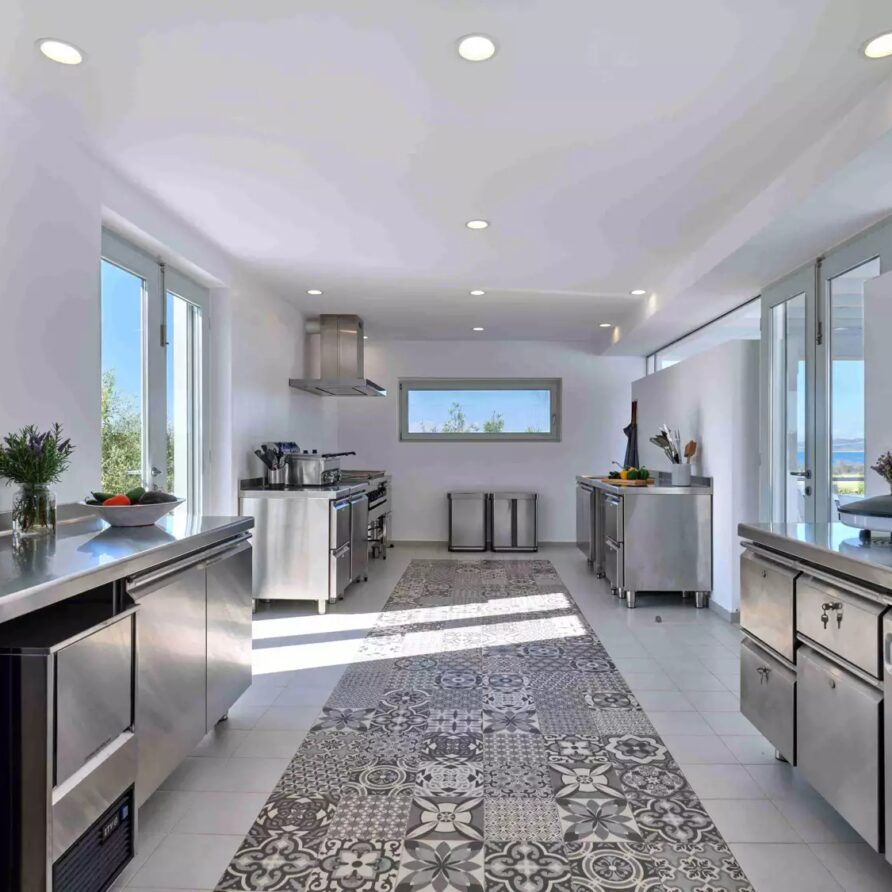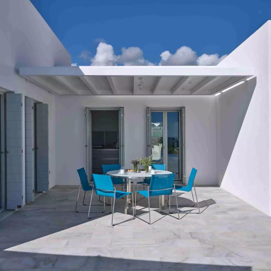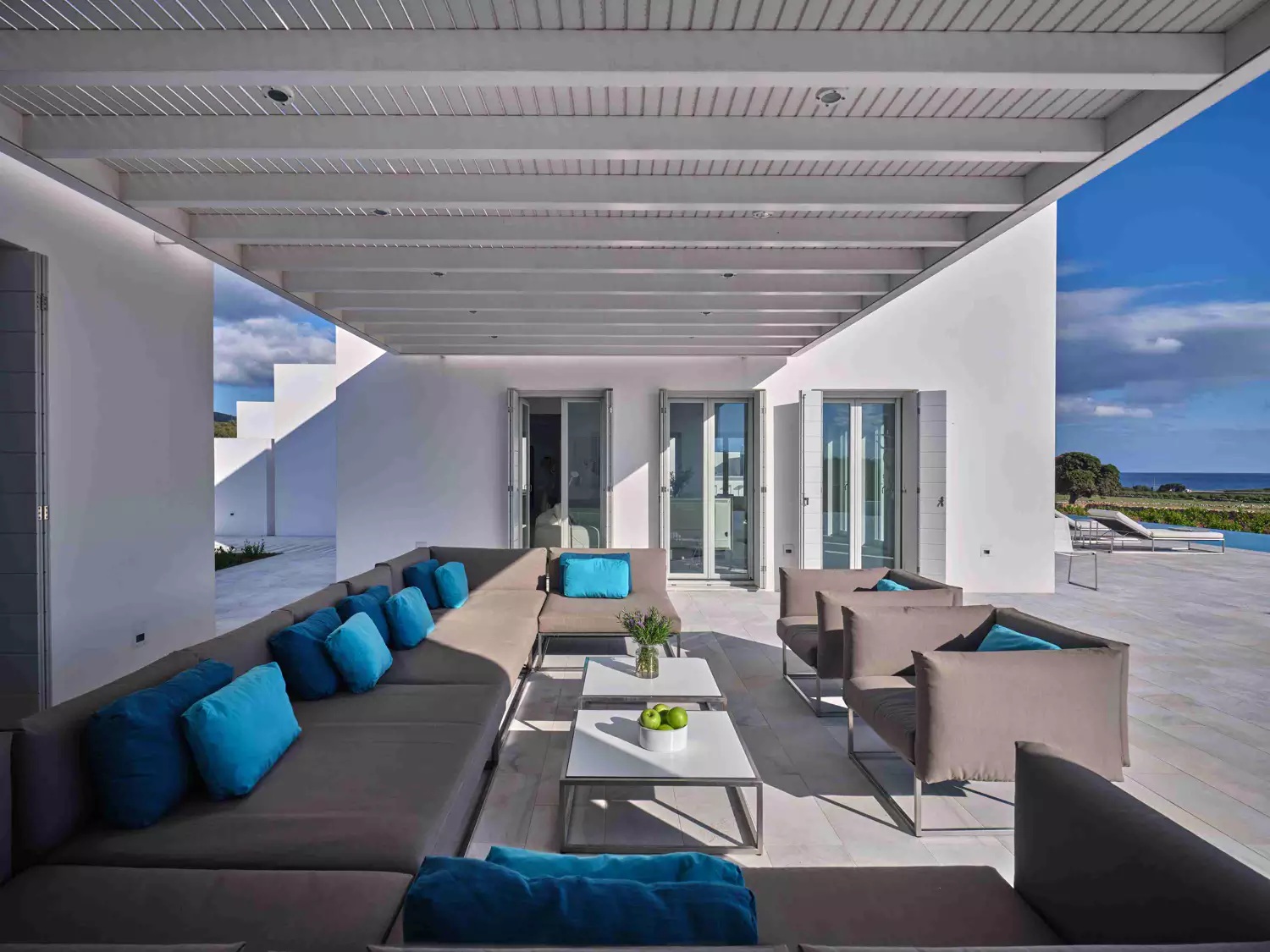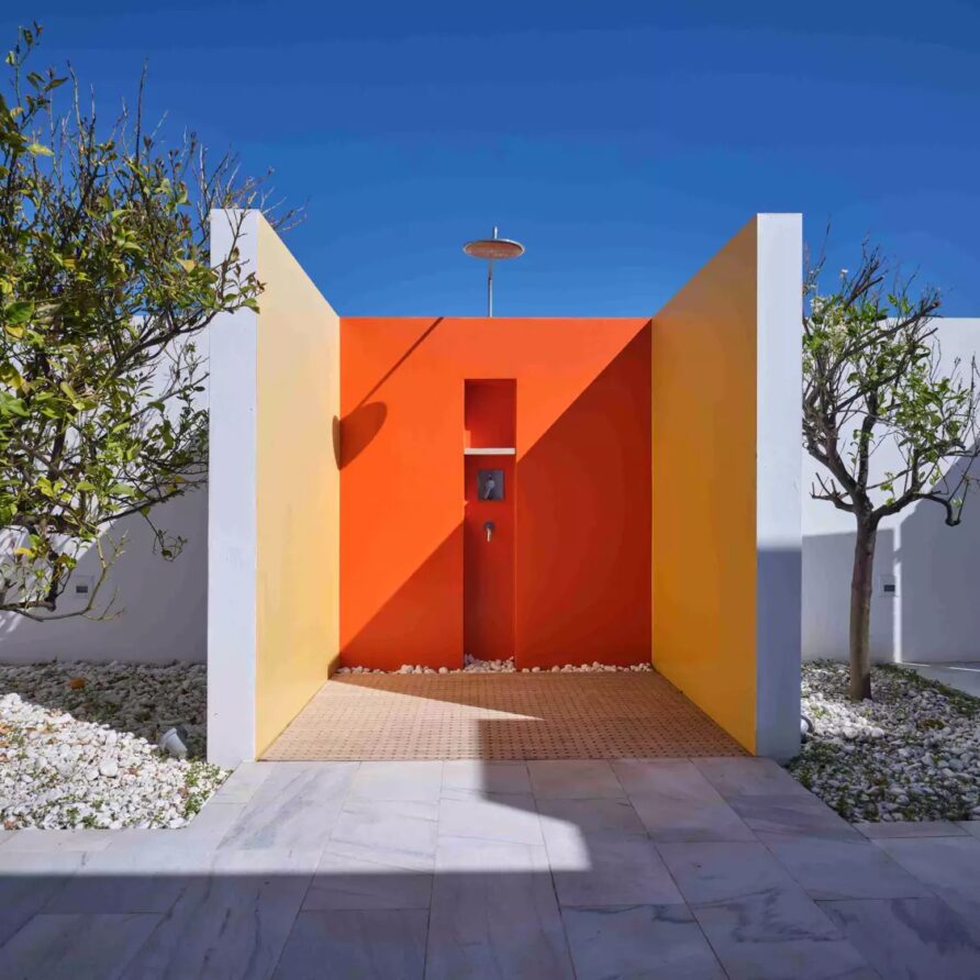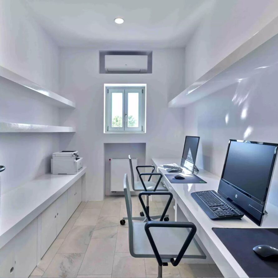 Despite its total minimalism, the villa is quite generous when it comes to diversified facilities: a wine cellar and fitness room are located on its lower level while, outside, guests can practice tennis in the villa’s private court and, at night, indulge in an atmospheric movie under the starlit sky in the movie area with a projector. Surrounded by grapevines, gardens with local and Mediterranean herbs and olive trees, the villa’s vast pool terrace features its 25m long swimming pool, several lounging spots and a pergola shaded sitting and dining area, a small bar and a professional barbecue kitchen.