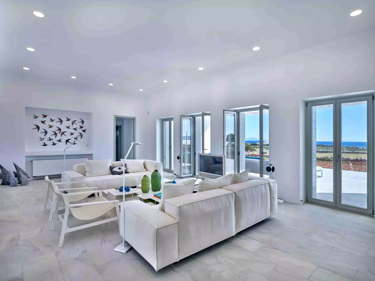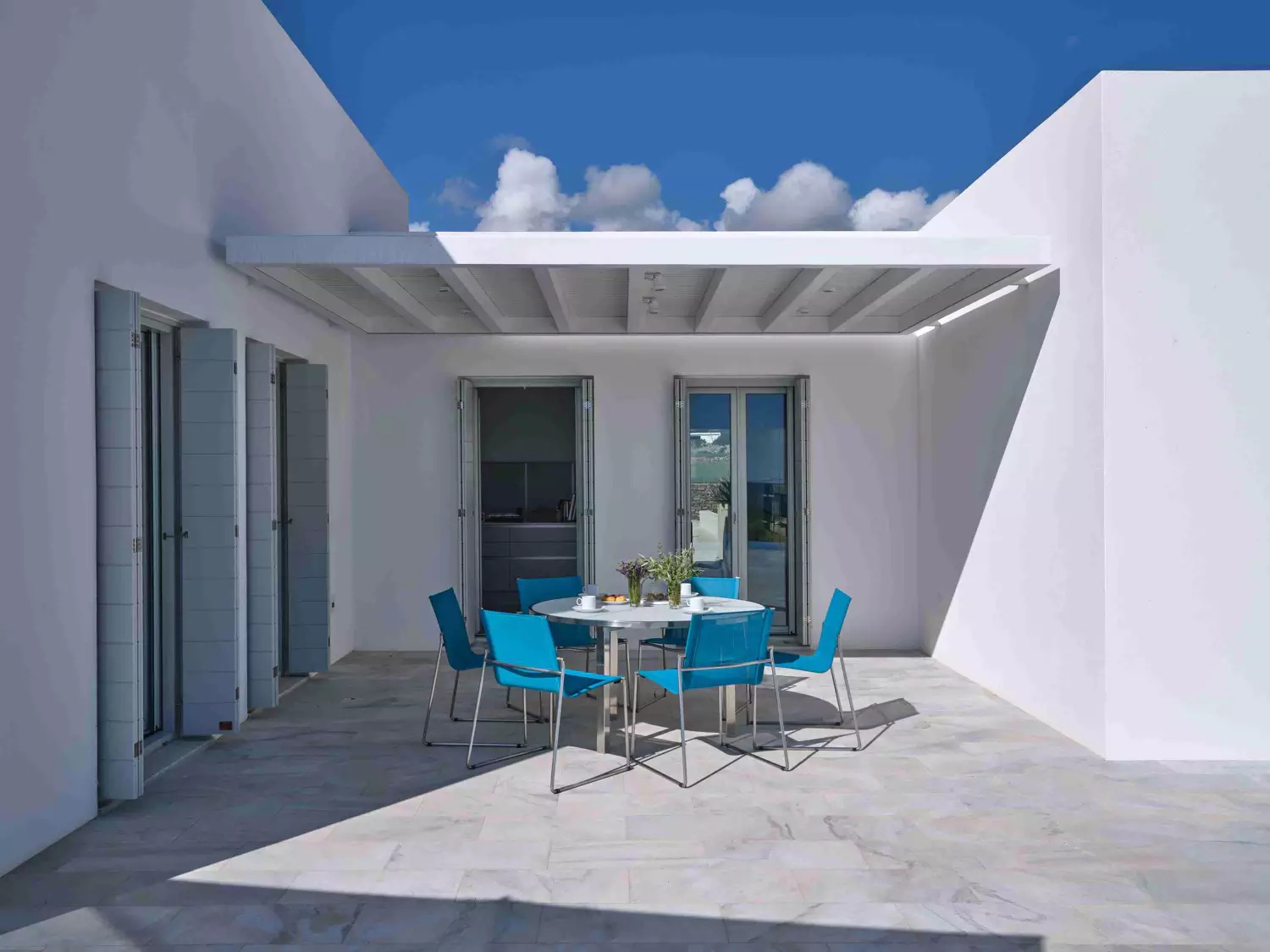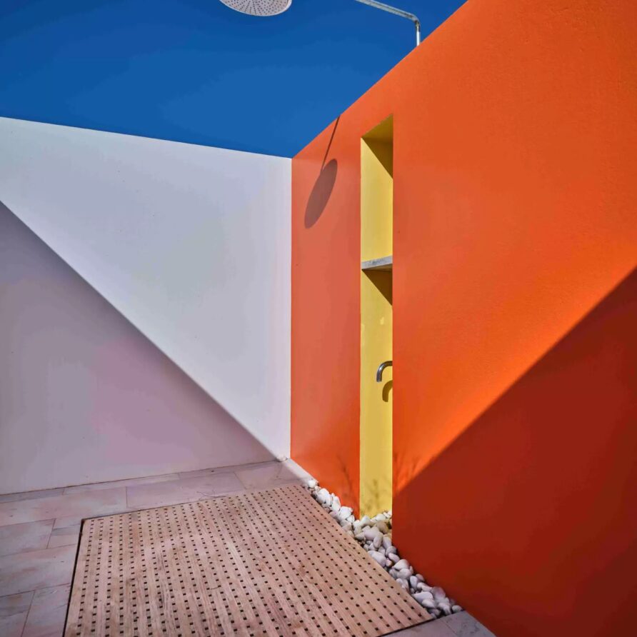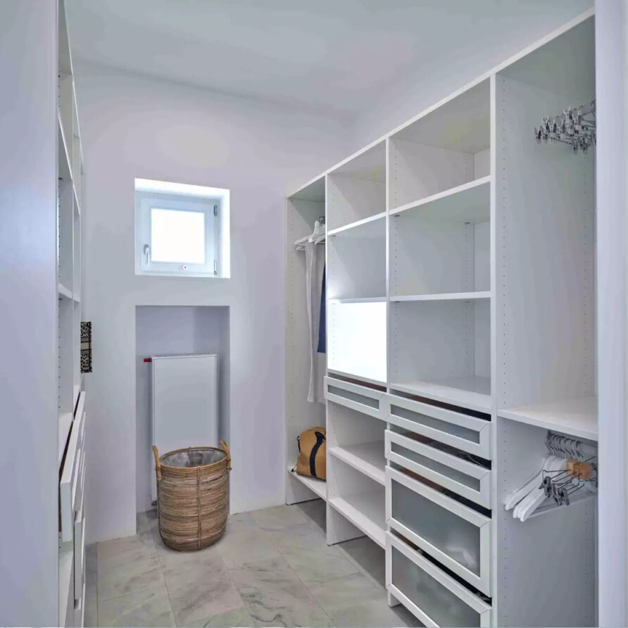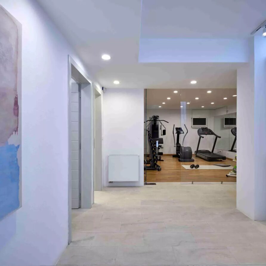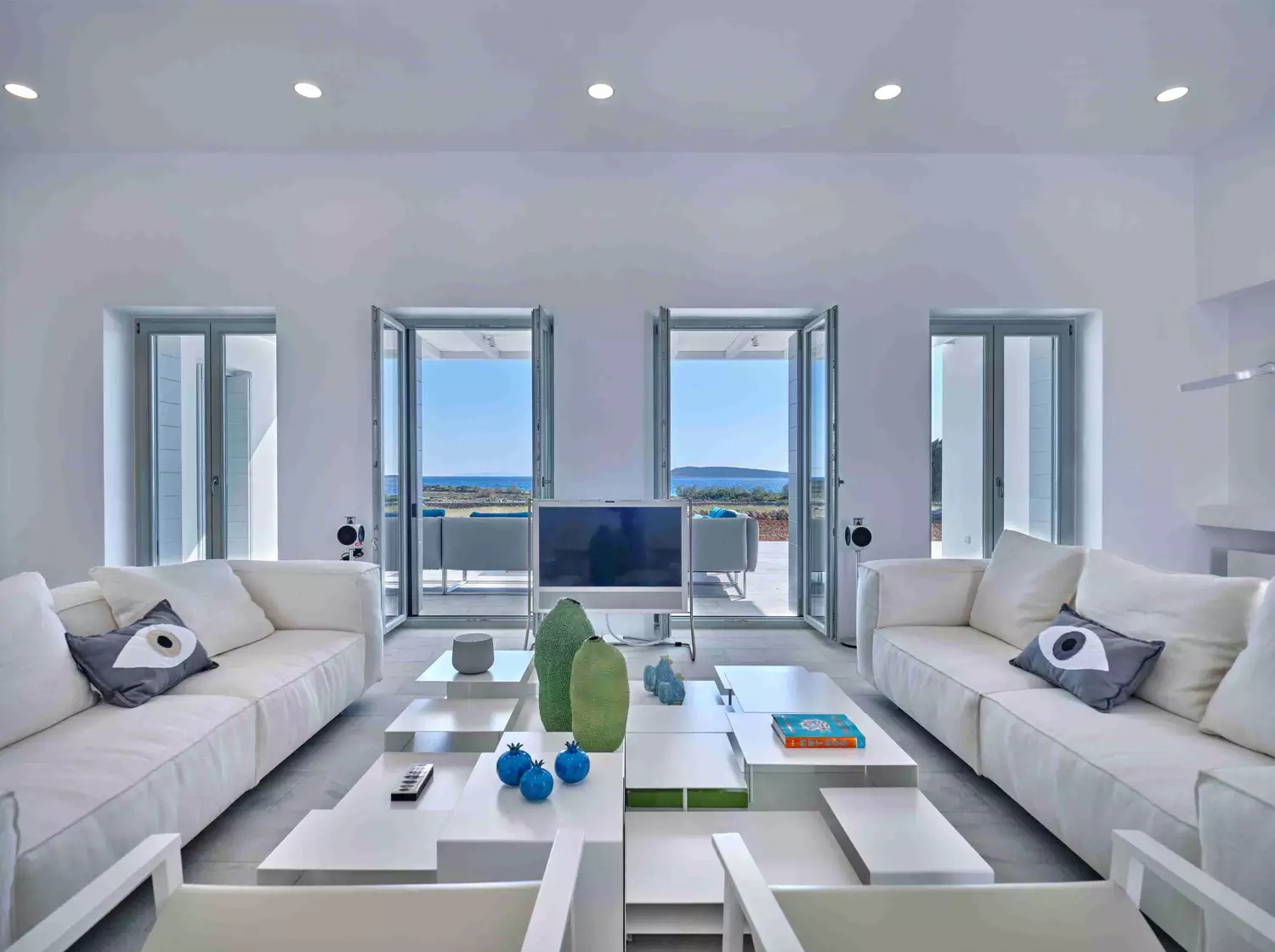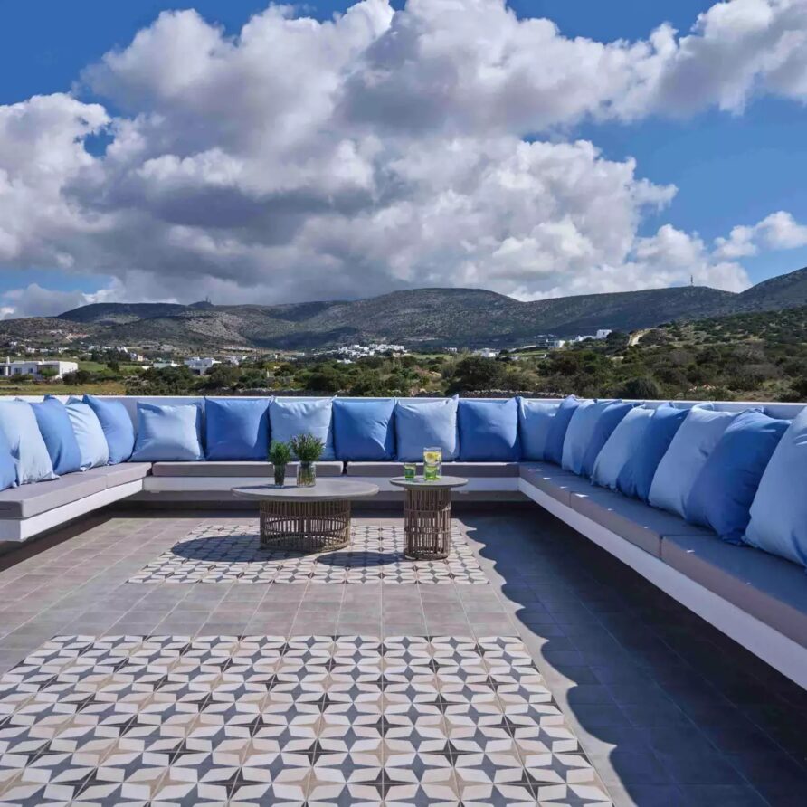 Despite its total minimalism, the villa is quite generous when it comes to diversified facilities: a wine cellar and fitness room are located on its lower level while, outside, guests can practice tennis in the villa’s private court and, at night, indulge in an atmospheric movie under the starlit sky in the movie area with a projector. Surrounded by grapevines, gardens with local and Mediterranean herbs and olive trees, the villa’s vast pool terrace features its 25m long swimming pool, several lounging spots and a pergola shaded sitting and dining area, a small bar and a professional barbecue kitchen.