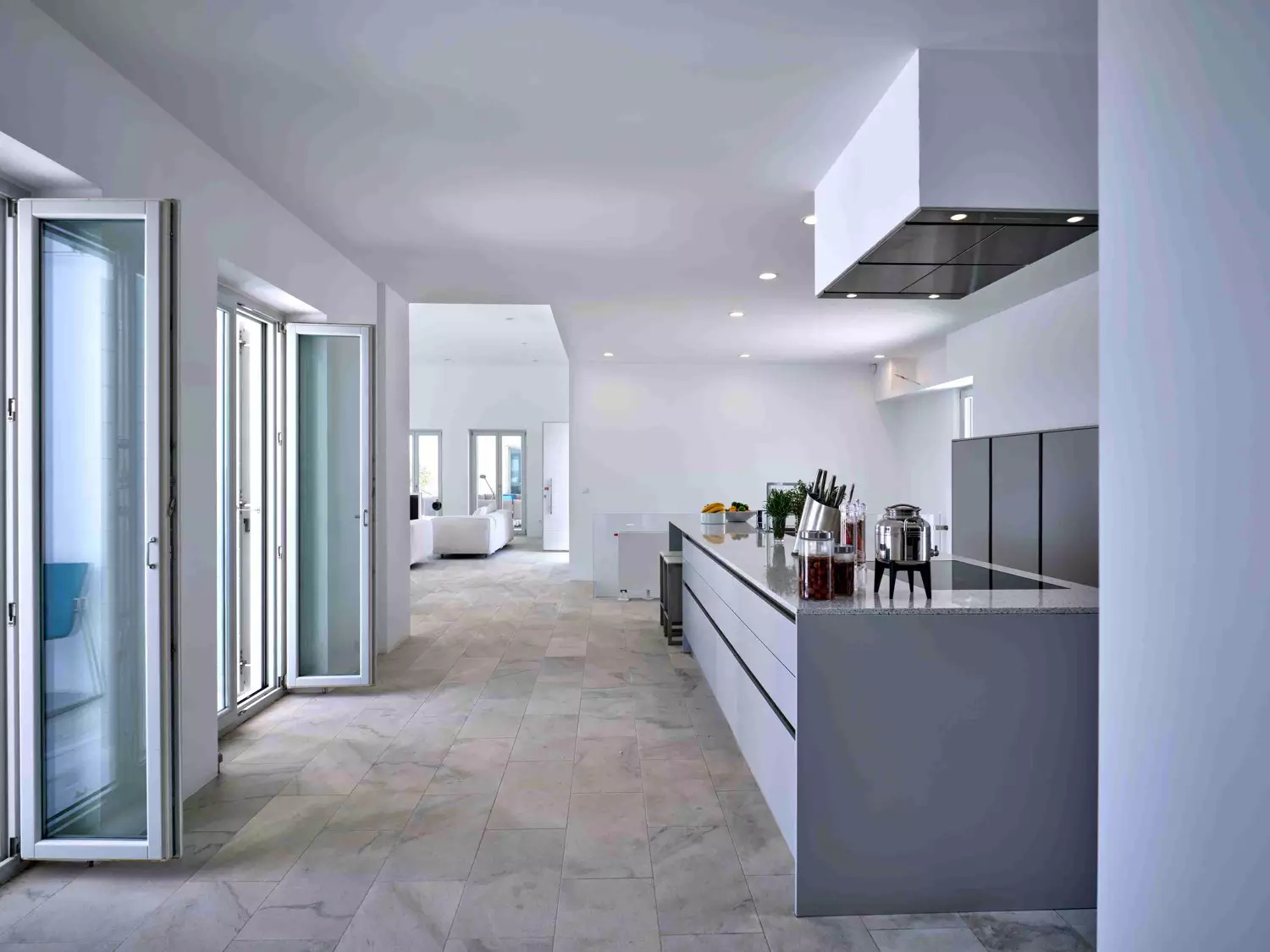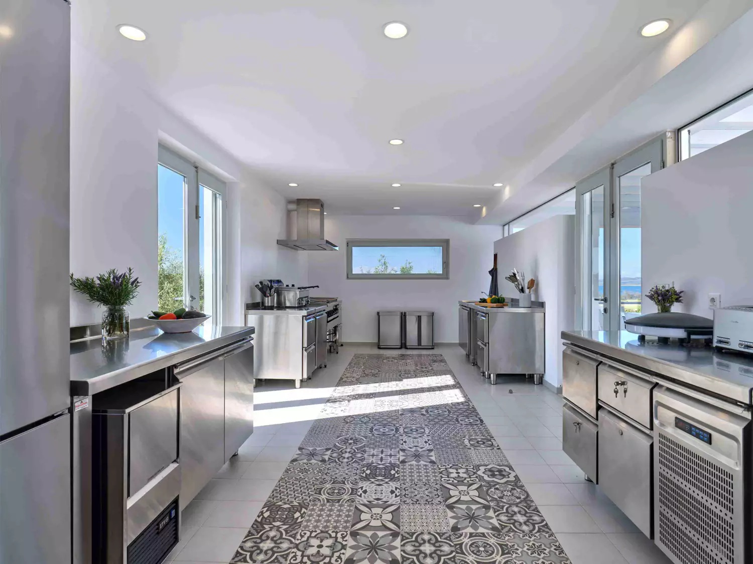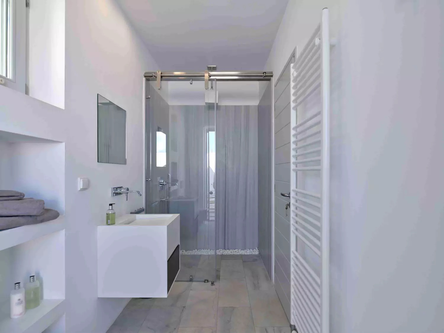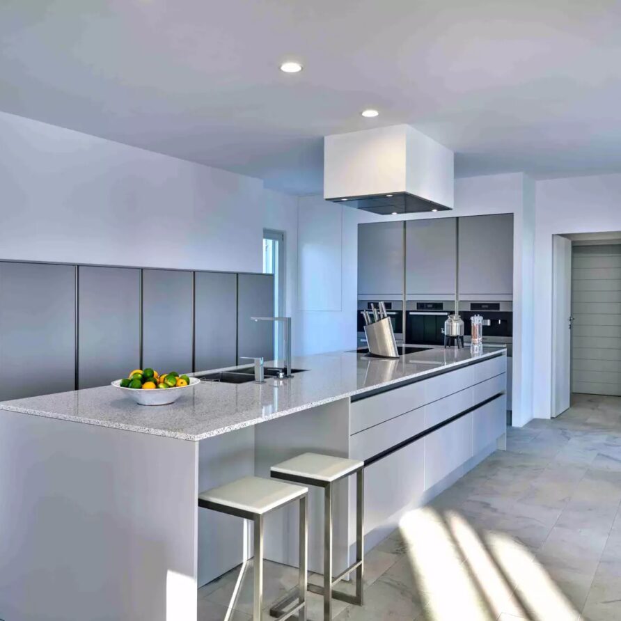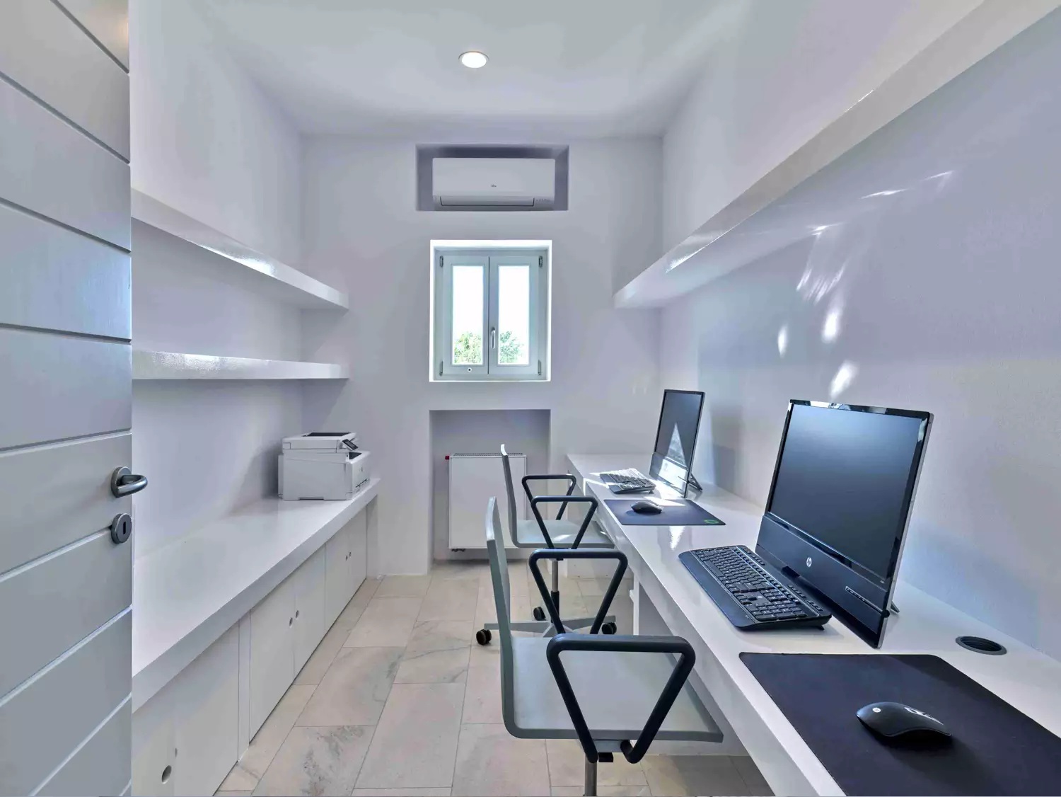 Despite its total minimalism, the villa is quite generous when it comes to diversified facilities: a wine cellar and fitness room are located on its lower level while, outside, guests can practice tennis in the villa’s private court and, at night, indulge in an atmospheric movie under the starlit sky in the movie area with a projector. Surrounded by grapevines, gardens with local and Mediterranean herbs and olive trees, the villa’s vast pool terrace features its 25m long swimming pool, several lounging spots and a pergola shaded sitting and dining area, a small bar and a professional barbecue kitchen.