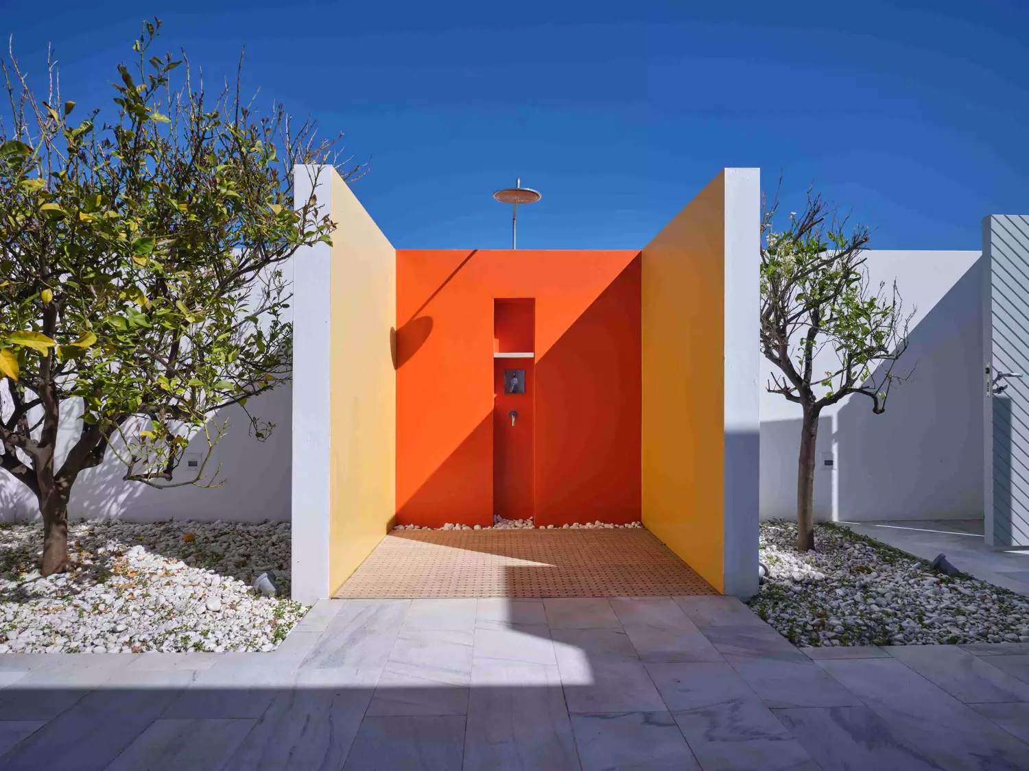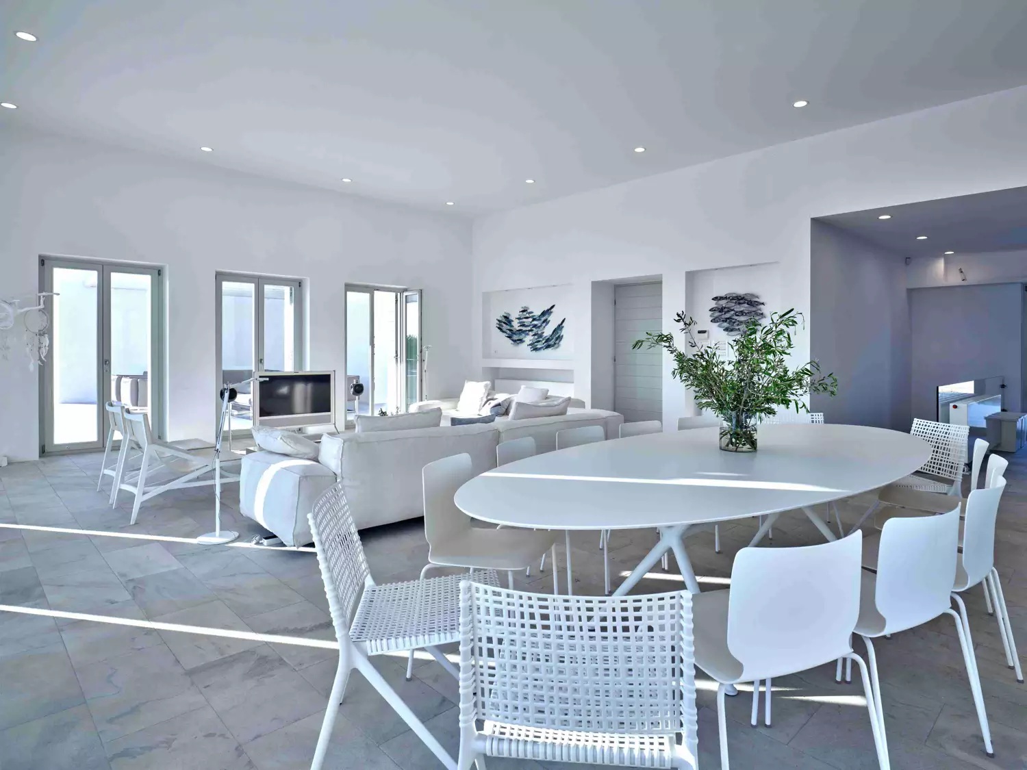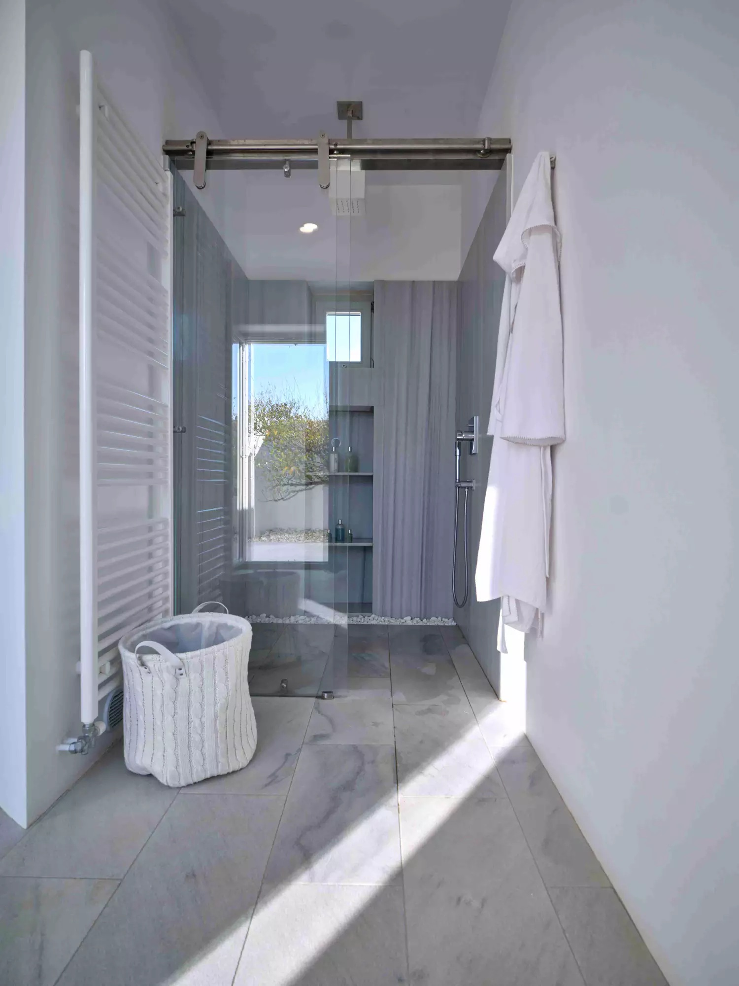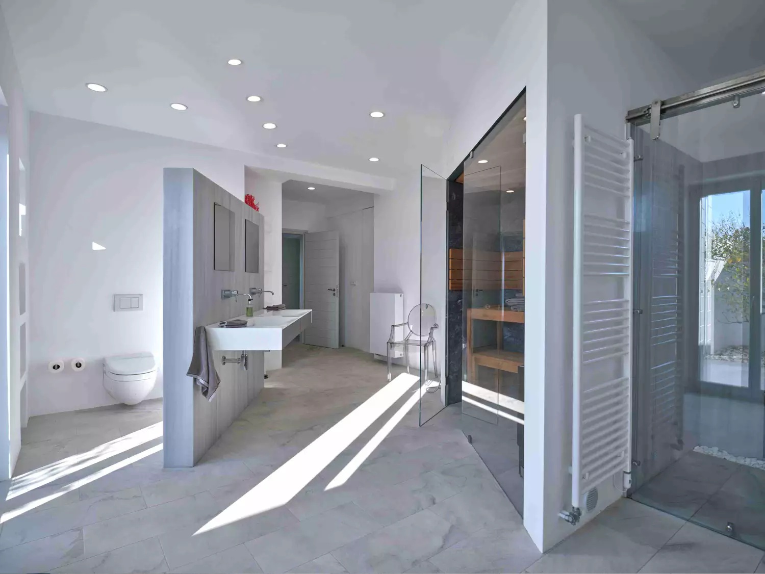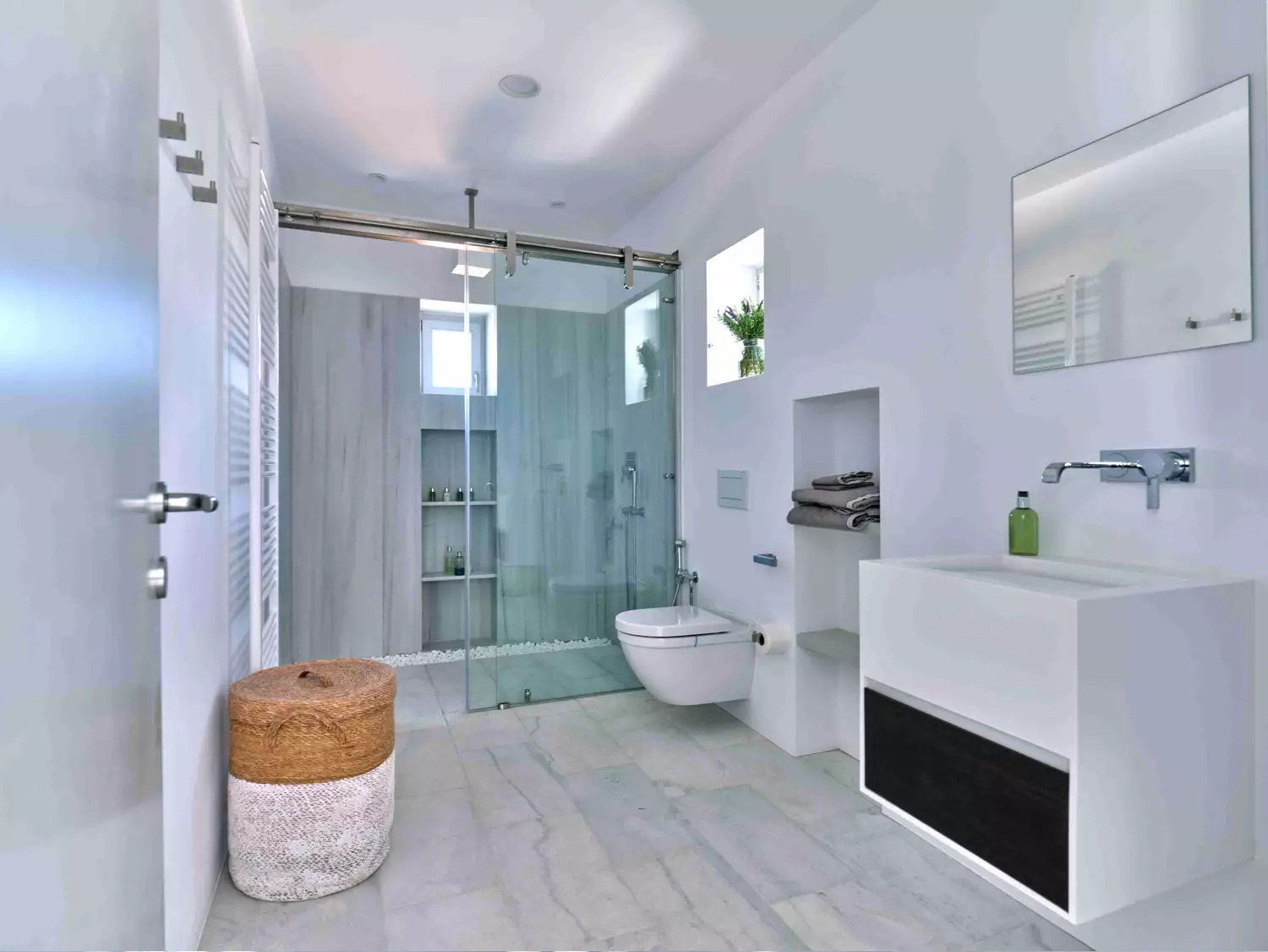 Despite its total minimalism, the villa is quite generous when it comes to diversified facilities: a wine cellar and fitness room are located on its lower level while, outside, guests can practice tennis in the villa’s private court and, at night, indulge in an atmospheric movie under the starlit sky in the movie area with a projector. Surrounded by grapevines, gardens with local and Mediterranean herbs and olive trees, the villa’s vast pool terrace features its 25m long swimming pool, several lounging spots and a pergola shaded sitting and dining area, a small bar and a professional barbecue kitchen.