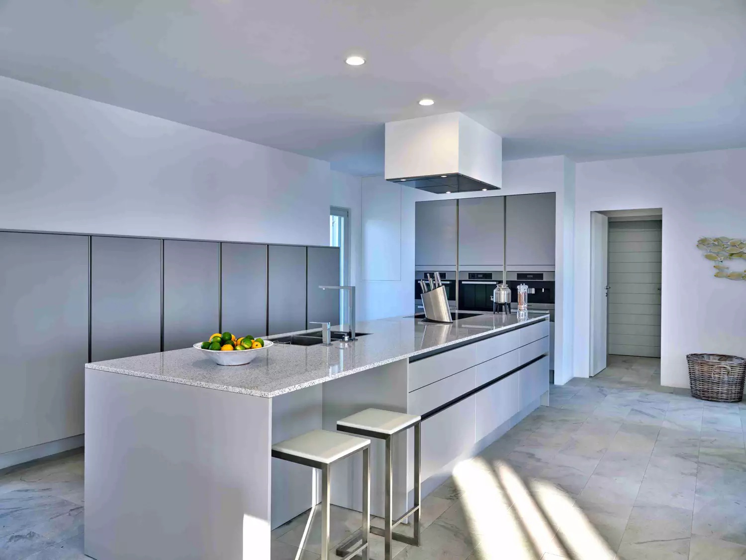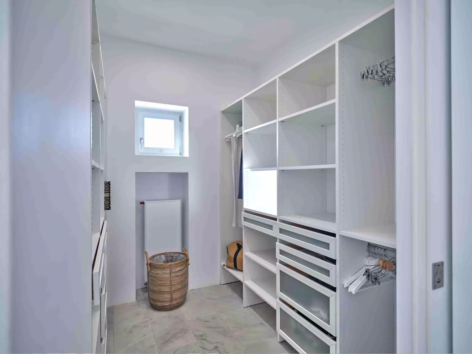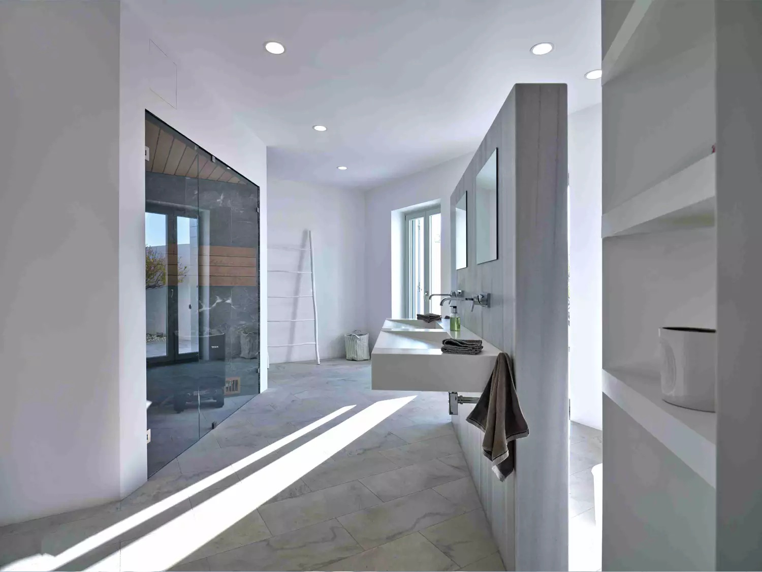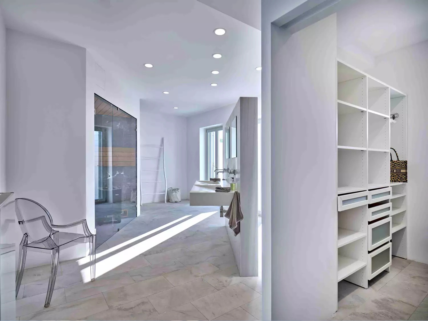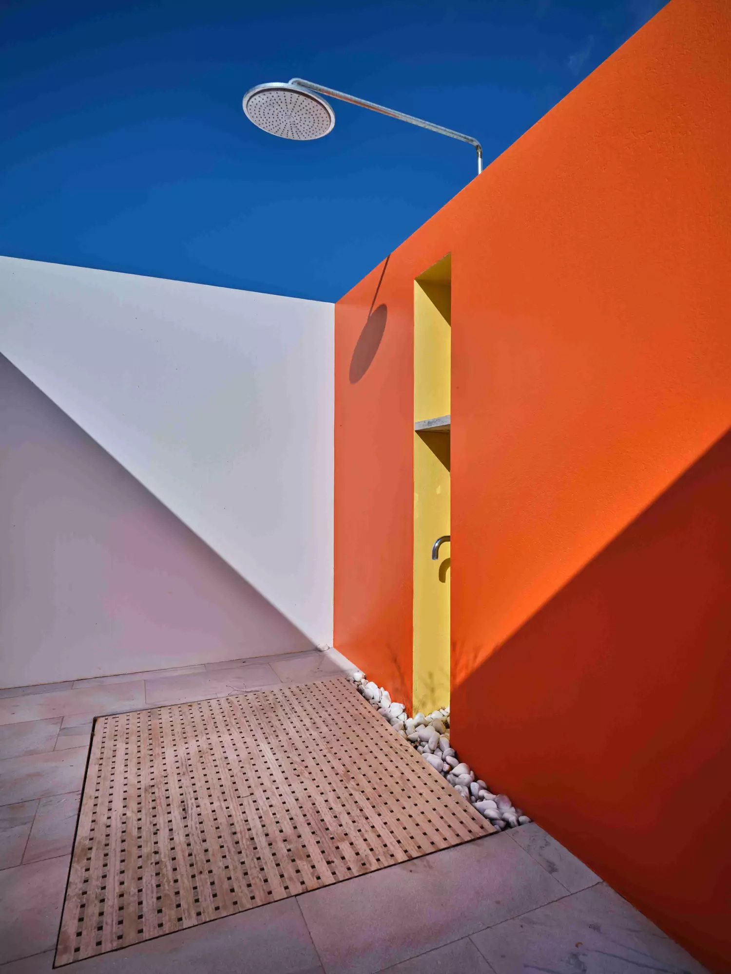 Despite its total minimalism, the villa is quite generous when it comes to diversified facilities: a wine cellar and fitness room are located on its lower level while, outside, guests can practice tennis in the villa’s private court and, at night, indulge in an atmospheric movie under the starlit sky in the movie area with a projector. Surrounded by grapevines, gardens with local and Mediterranean herbs and olive trees, the villa’s vast pool terrace features its 25m long swimming pool, several lounging spots and a pergola shaded sitting and dining area, a small bar and a professional barbecue kitchen.