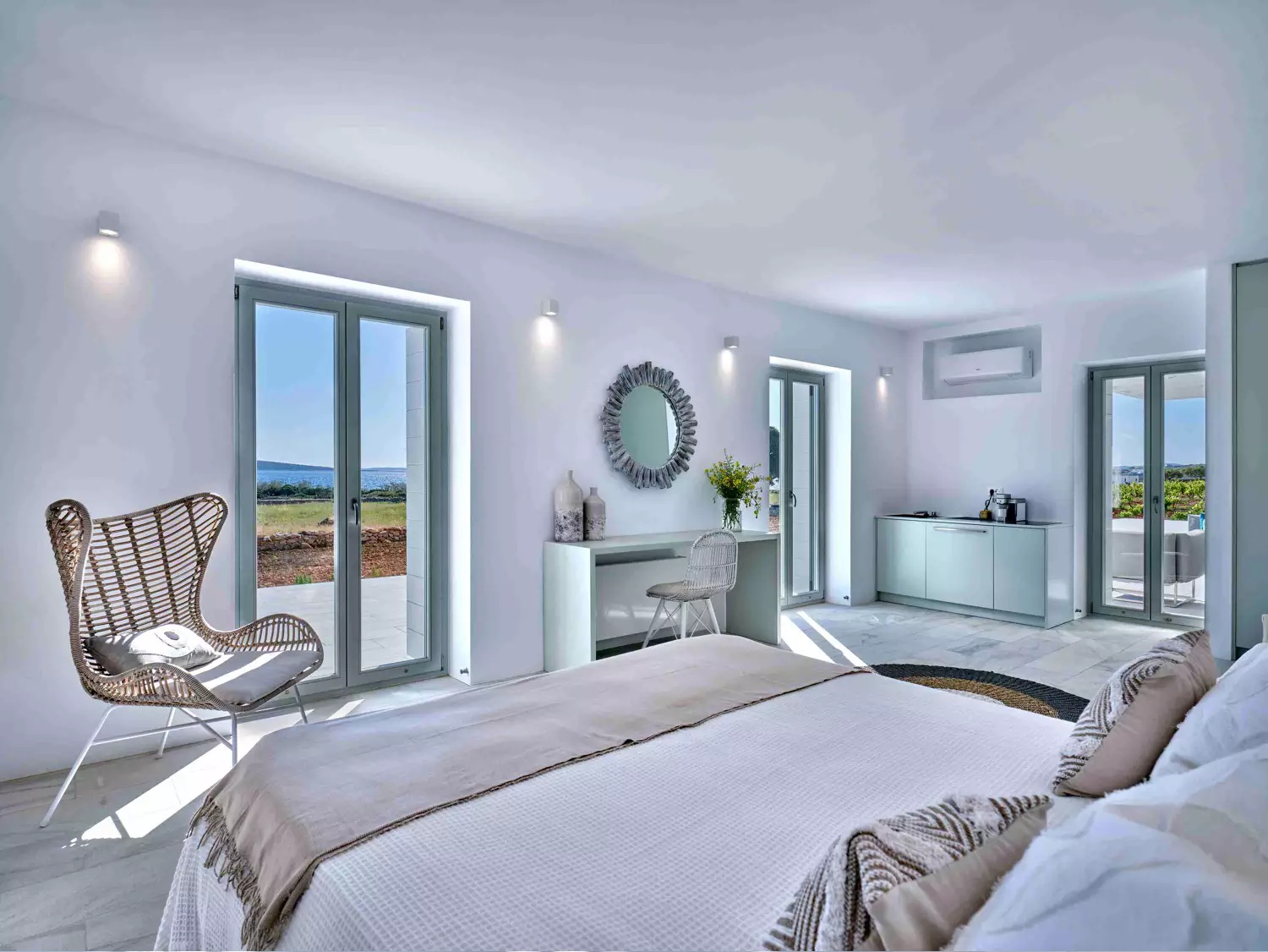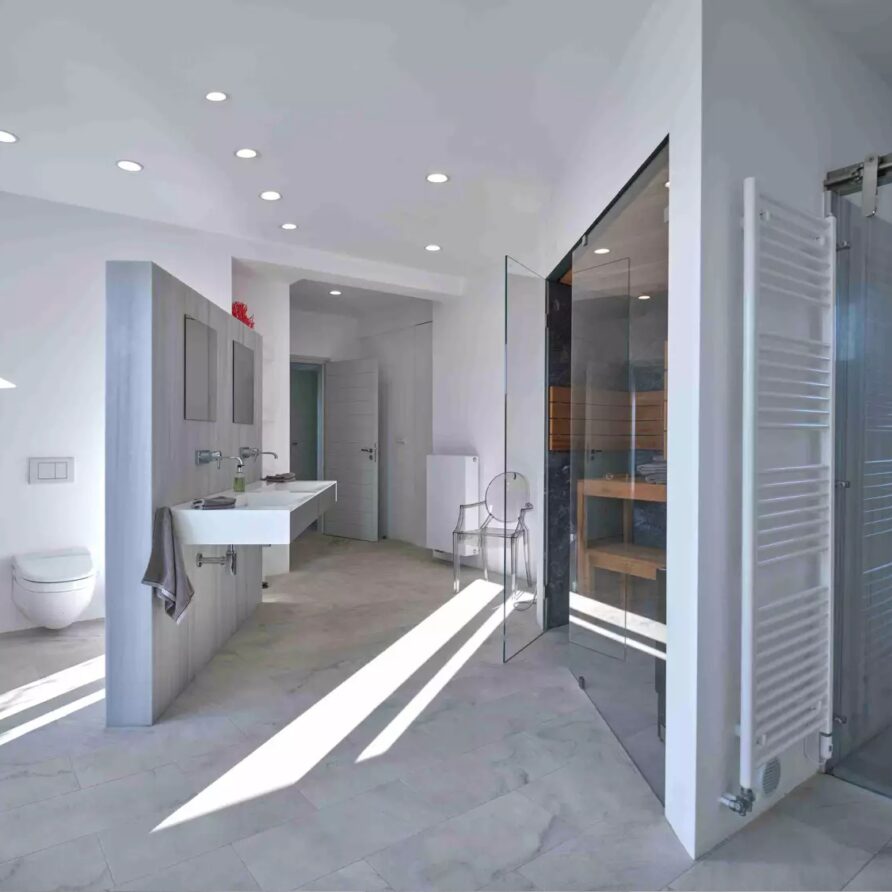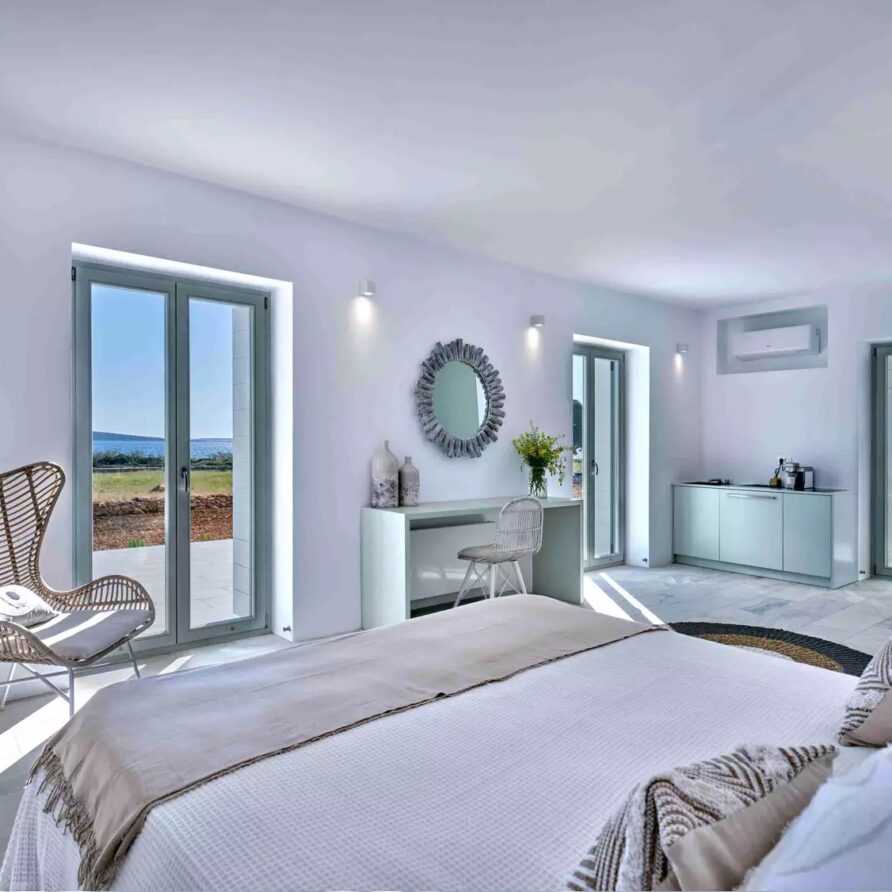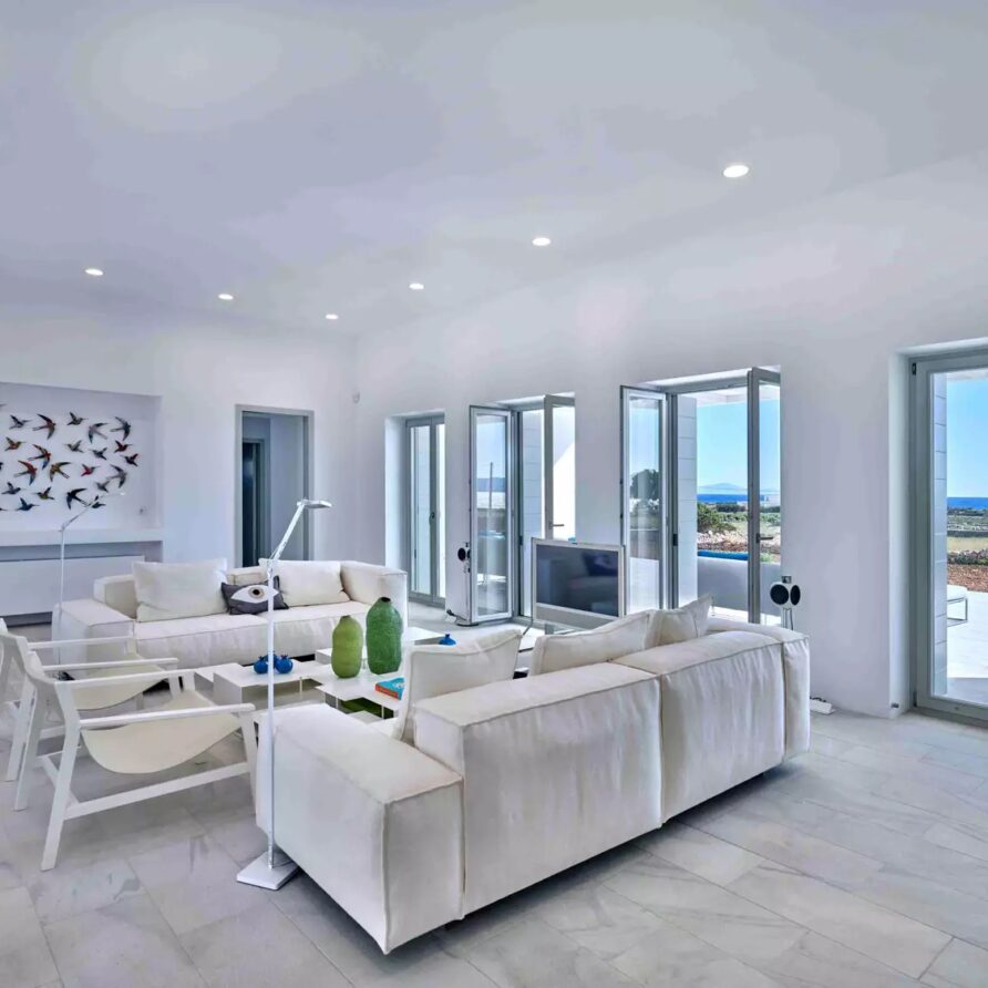 As soon as you enter the house, you will come across a voluminous living room where the white and off-white colors are the prevailing sensation of the space along with the totally minimal furnishings. This is an open-plan space that also features the contemporary, fully equipped kitchen and the dining area of the villa. A master bedroom with walk-in closet, en-suite bathroom and sauna for four is found further in the ground level. The property also features 4 more double en-suite bedrooms independently accessed from the terrace with kitchenette and queen size sofa beds.