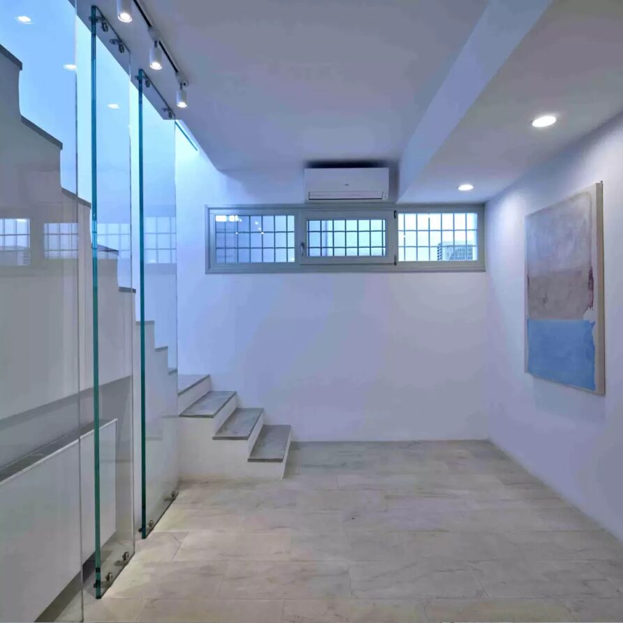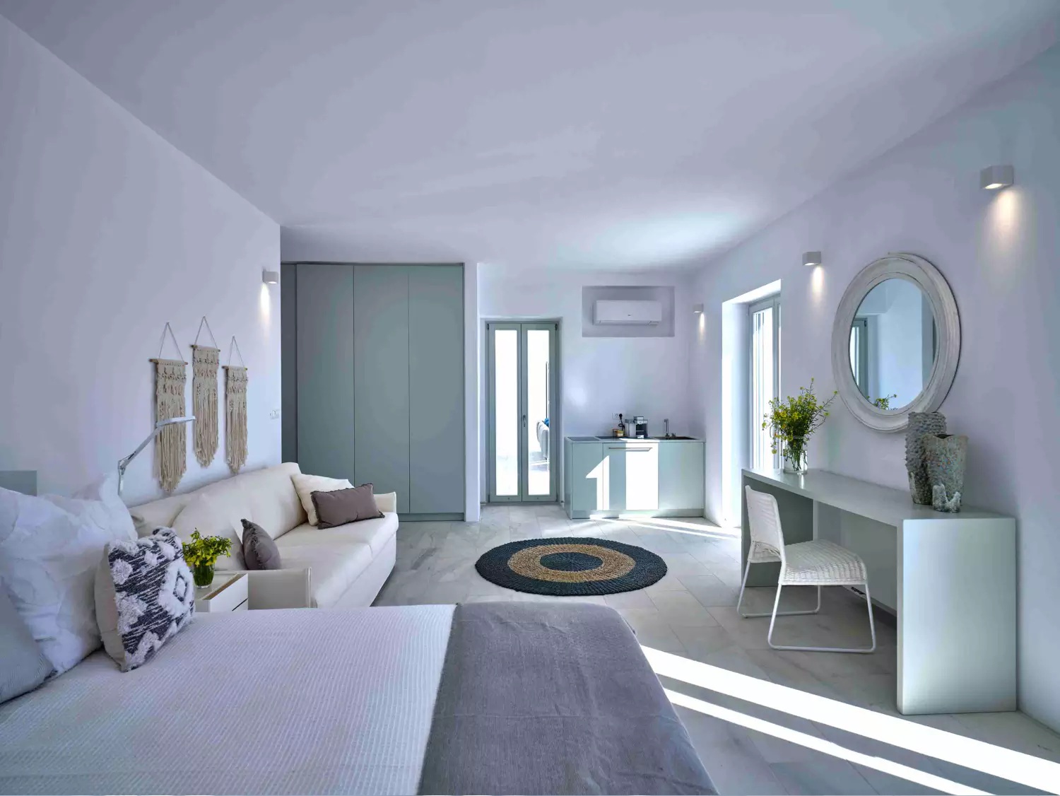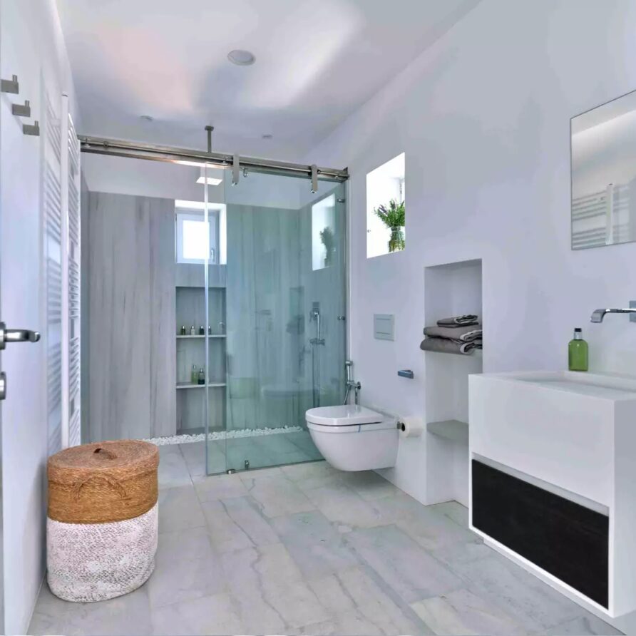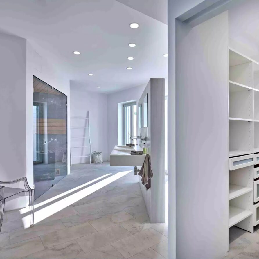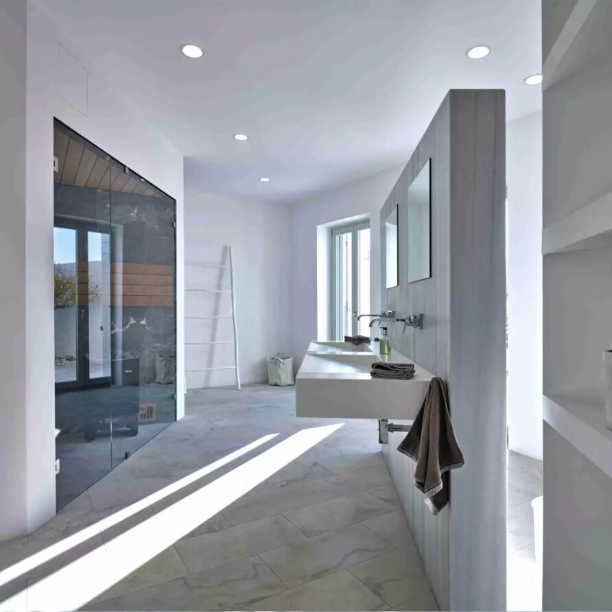 As soon as you enter the house, you will come across a voluminous living room where the white and off-white colors are the prevailing sensation of the space along with the totally minimal furnishings. This is an open-plan space that also features the contemporary, fully equipped kitchen and the dining area of the villa. A master bedroom with walk-in closet, en-suite bathroom and sauna for four is found further in the ground level. The property also features 4 more double en-suite bedrooms independently accessed from the terrace with kitchenette and queen size sofa beds.